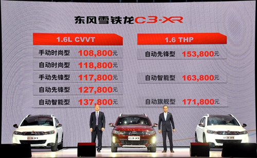 C3-XR为东风雪铁龙推出的首款SUV车型,此次上市共拥有8款车型,分别搭载1.6升自然吸气和1.6THP涡轮增压发动机,售价区间10.88万-17.18万元。涡轮增压版C3-XR包括3款,变速类型均为自动,而自然吸气版则包括5款车型。