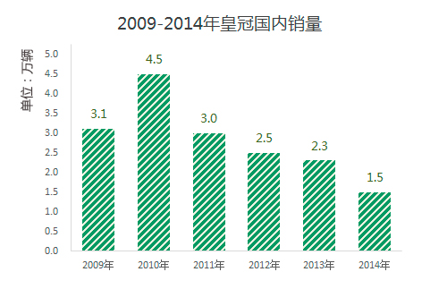 皇冠于2005年国产,凭借着之前不错的口碑,在之后的几年里销量确实不错。2007年销量达到了峰值5.3万辆,不过没多久便出现了下滑。2009-2014年皇冠销量分别为:3.1万辆、4.5万辆、3.0万辆、2.5万辆、2.万辆和1.5万辆。也就是说,从2010年开始,销量一直在下滑。一汽丰田在2012年对皇冠进行过一次改款,但依然止不住其下滑的脚步。一汽丰田应该慌了,改款后不到3年便迅速换代。