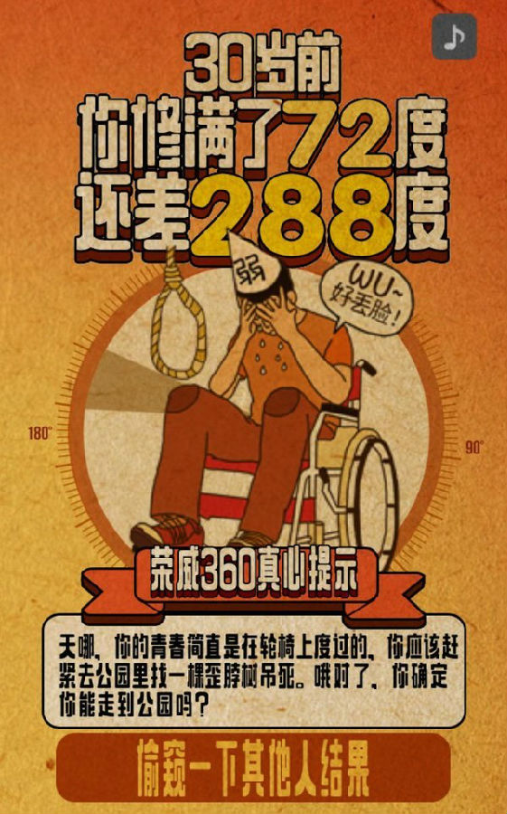 这个“重口味”的H5是上汽专为荣威360目标消费者量身定制的一次人生修满测试,虽然H5中没有大量提及产品,但问题却始终围绕人生敏感点、趣味点,以情感为主,反而将主打客群与产品联系得更为紧密。