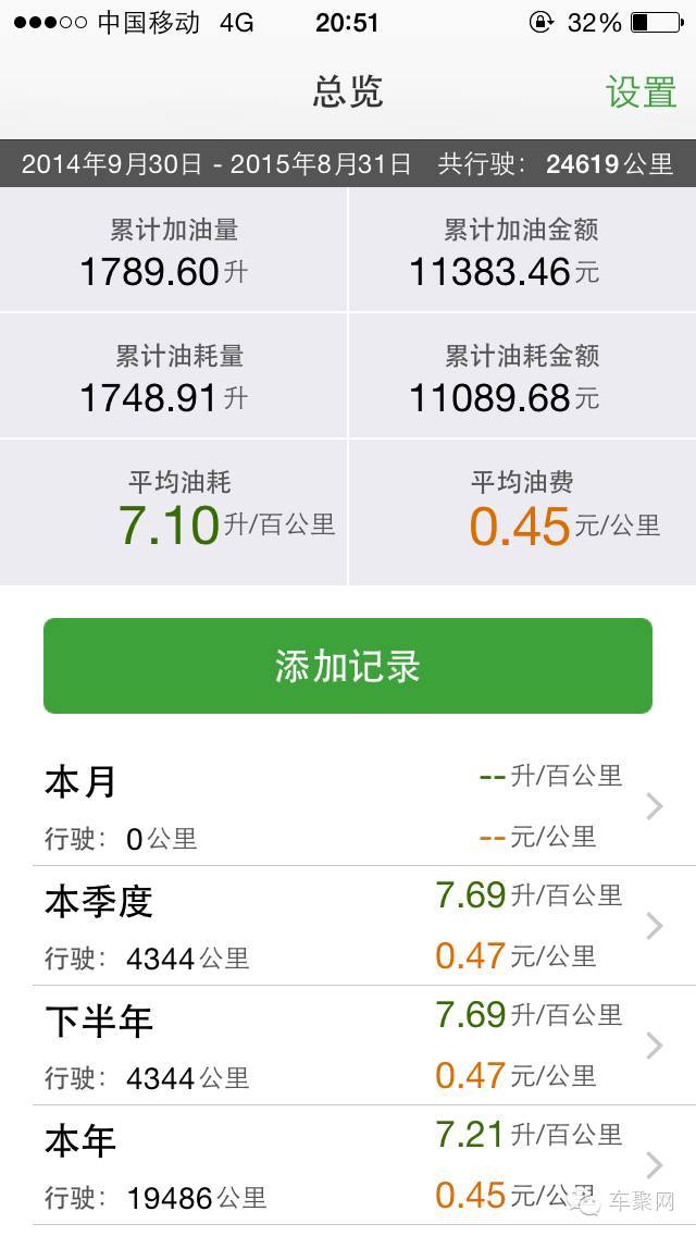 油耗是一个十分主观的东西,因为你的驾驶习惯和路况条件,会大大左右油耗结果。与单位同事的三台帝豪1.5差不多,我的百公里油耗都也在8升左右,下图是本人用某APP计算出的油耗数据。