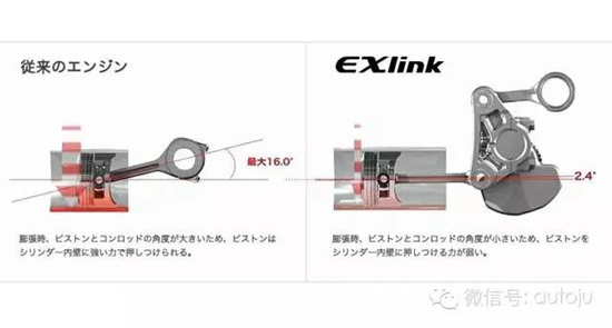 这样做有个好处就是当汽油发生爆炸时,EXlink发动机的连杆与活塞呈现的是垂直状态,而一般的发动机均呈现一定夹角。如果连杆与活塞存在夹角,按照力的分配原则,会造成活塞在横向上的力过大,从而造成对气缸壁的压力增大,摩擦损失也就增大。