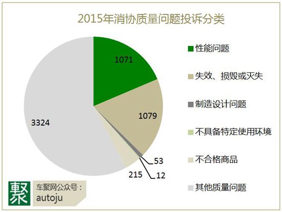 在共计5,754件质量投诉中,车辆性能问题和失效、损毁或灭失占得较大比重,共计1,079件,而产品性能投诉紧跟其后,共计1,071件。另外还有消协未具体归类的投诉问题共计3,324件。