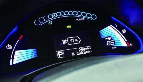 日产聆风在组合仪表中设有电池容量计(最右侧狭窄弧形区域,共12格)