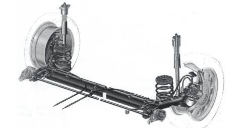 ▎扭转曲柄桥,横向连接位置非常接近车轮中心,具有近似于整体式车桥的性能。