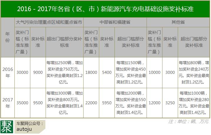 今年1月份,财政部、科技部、工业和信息化部、发展改革委和国家能源局联合发布了《关于“十三五”新能源汽车充电基础设施奖励政策及加强新能源汽车推广应用的通知》,这个政策明确说明了2016年至2020年中央财政将继续安排资金对充电基础设施建设、运营给予奖补,详情如下表所示。