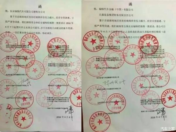 近日,微信朋友圈被长安福特湖南24家经销商集体“反水”的照片刷屏。这两张照片,是长安福特湖南24家经销商写给长安福特的“公开信”。信中称,鉴于目前湖南地区所有经销商库存压力极大、经营非常困难、亏损严重等,湖南省全体长安福特经销商一致要求暂时停止提车,并不再接收自动配送的板车资源,否则一切后果由长安福特自行承担。