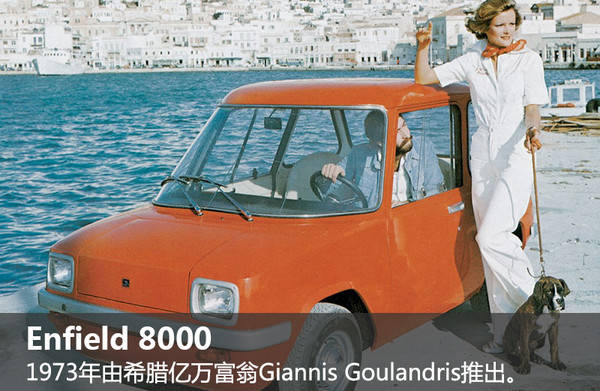 Enfield 8000是一款双门纯电动轿车,在1973年由希腊亿万富翁Giannis Goulandris发布,并于1977年引入英国。由于受制于当时希腊电动车的相关税收分类等问题,这款车大部分被出口到了英国,截止至1977年,总共生产了120台Enfield 8000,其中65台被英国南部的电力局买走。
