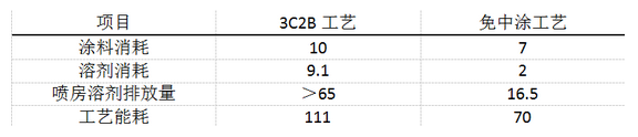 下表是关于3C2B工艺和免中涂工艺的各向指标对比,可以看到免中涂工艺的各项指标都是优于3C2B工艺的,在降低能耗和VOC排放上确实有着明显的优势。
