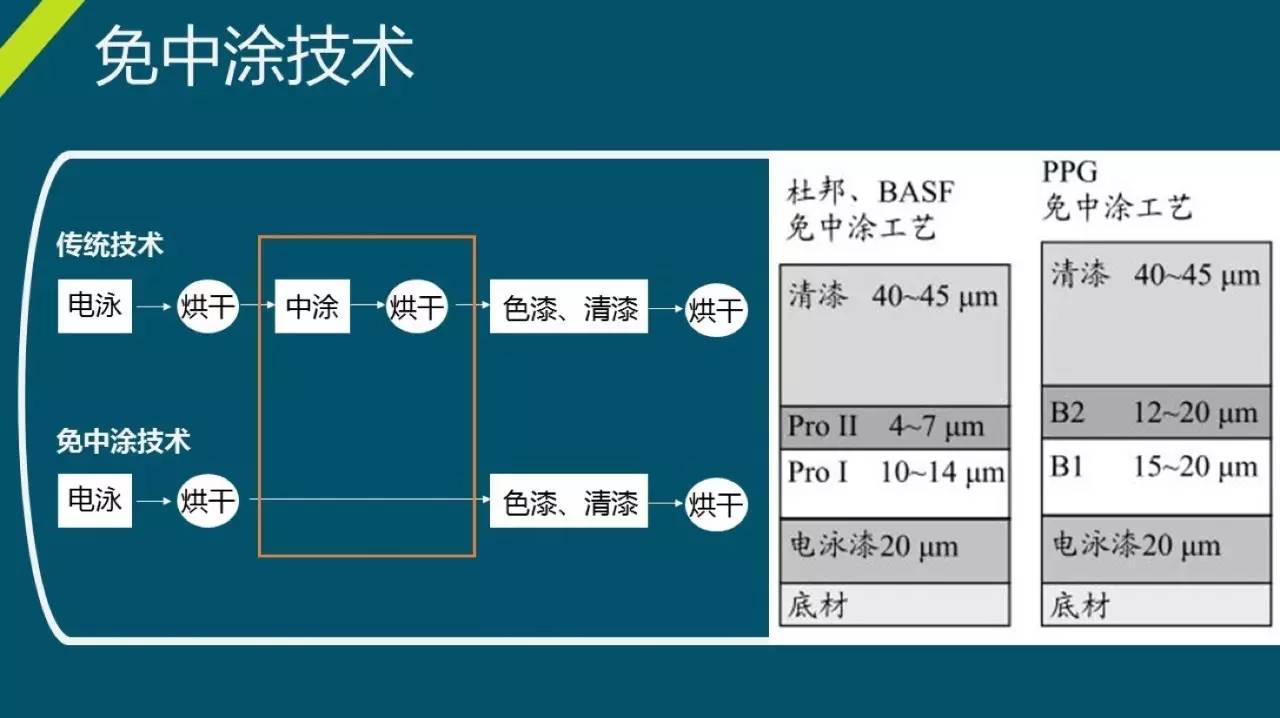 免中涂技术并不是说直接舍弃中涂层,仅仅喷涂色漆层和清漆层,而是通过工艺的改进,把中涂层的功能加到色漆层里,将中涂层和色漆层合并成一个涂层,这样既可以减少VOC的排放,又可以降低成本。关于免中涂工艺,常见的有杜邦的工艺、BASF公司的IP双底色工艺以及PPG公司的B1B2工艺等。