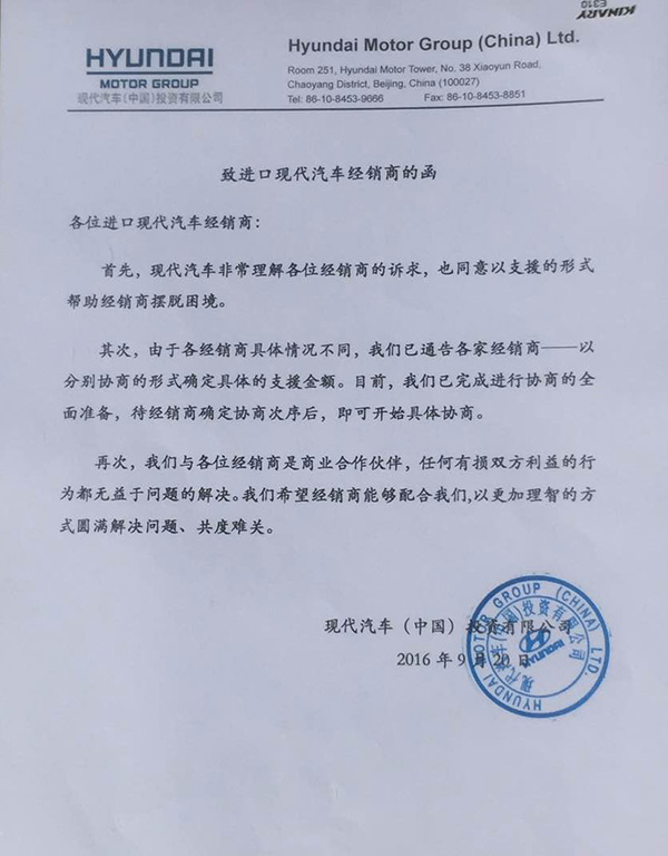 20日中午,一位不愿透露姓名的经销商向澎湃新闻记者出示了一张现代汽车致经销商的信函,信中表示,现代汽车同意以支援的形式帮助经销商摆脱困境,具体的解决方式为分别协商,以确定支援金额。