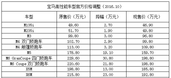 近日,据宝马中国官方消息,宝马旗下M系高性能车“迎来”一次集体价格下调。其中,宝马M6 GranCoupe四门轿跑降幅最大,从原售价229.6万下调至198.8万,降幅达到30.8万,而其他M系旗下车型售价也均有不同程度下调(具体见如下表格)。