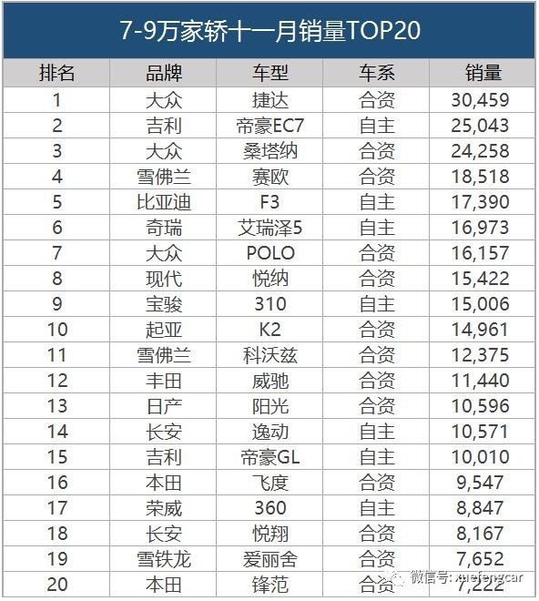不得不说,比起从前捷达、富康、桑塔纳“老三”样时代,如今的选择太多了。我们从刚出炉的11月销量榜中挑出了价格7-9万元的可选车型,不难看出,“老三样”的后代仍颇具影响力,但更多的对手已经完成了超越,尤其是中国本土品牌。