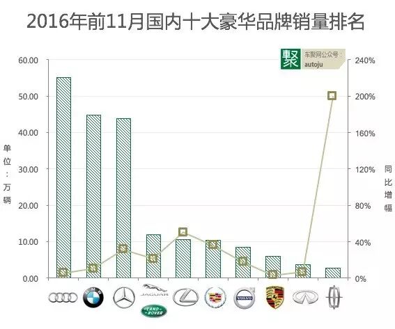 11月份捷豹路虎中国销量为11,591辆,同比攀升42%,今年前11个月,捷豹路虎在中国市场总销量为105,189辆,2016年度究竟谁能排在中国市场豪华品牌第四名,目前尚不可知。