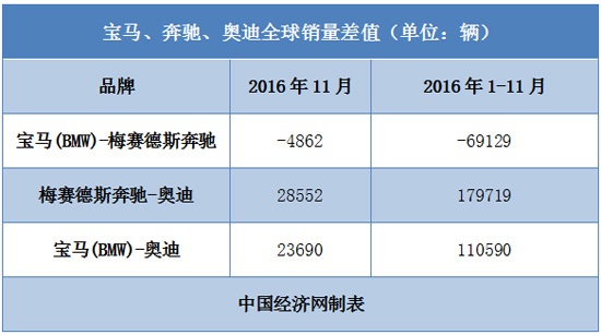 2016年1-11月,奔驰、宝马、奥迪全球销量数据