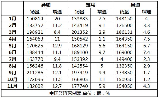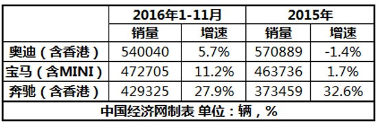 奥迪、宝马、奔驰2016年1-11月,以及2015年在华销量数据