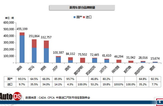 2016年前三季度,部分品牌国产及进口销量对比,数据来源中国汽车流通协会