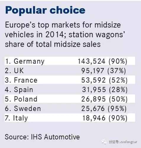 ▲这是2014年欧洲各主要汽车市场上,中级轿车中旅行版本所占的市场份额。德国、瑞士、意大利旅行车的份额都在90%以上