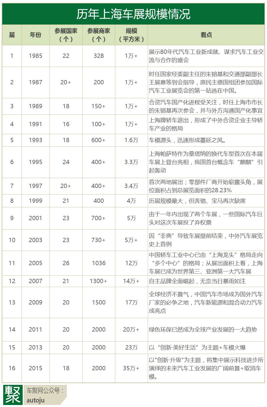 17届的发展,上海国际车展规模已经扩大了近三十倍,参展厂家扩大近十倍,从过去需要国家领导人出面洽谈才能搞定,到如今国外厂家蜂拥而至。中国车市的“东方明珠”是否能带来一场饕餮盛宴,车聚君会持续给你带来最新资讯,敬请期待。
