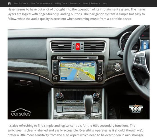 ▲Carsales说哈弗H8的导航简单易懂非常好用,而且娱乐系统丰富,音质出色。便利性功能非常好用,按键排布清晰合乎逻辑,自动感应雨刮的灵敏度很高。这些都可以看出哈弗H8在细节上下的功夫。