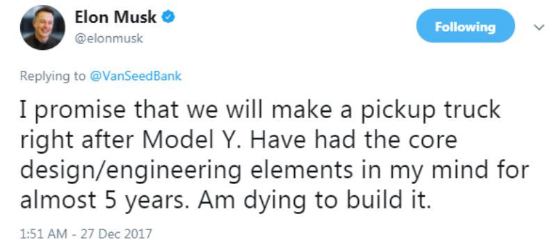 埃隆·马斯克(Elon Musk) 12月27日在推特上发文宣布,特斯拉将发布电动皮卡,Model Y 量产后马上就推出皮卡车型。这款皮卡的主要外观设计、核心工程方案,已经在马斯克的脑海里酝酿了差不多5年之久。