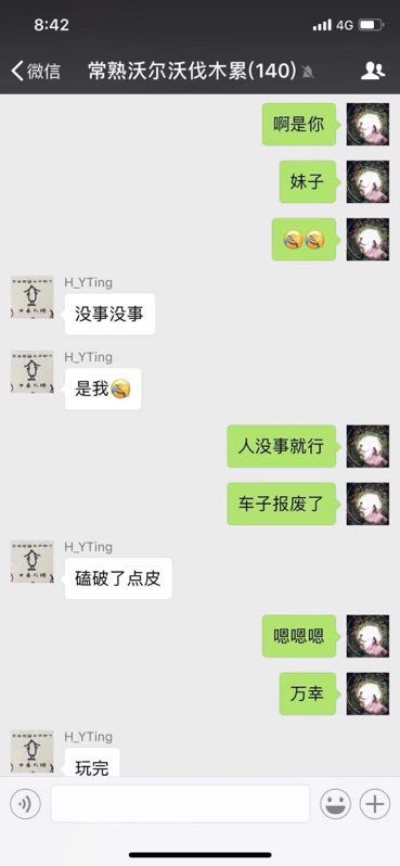 从对话看,这位微信名为“H_YTing”的用户就是事件中V40的女司机。她在常熟沃尔沃车主群中回复:“没事没事,磕破了点皮。”