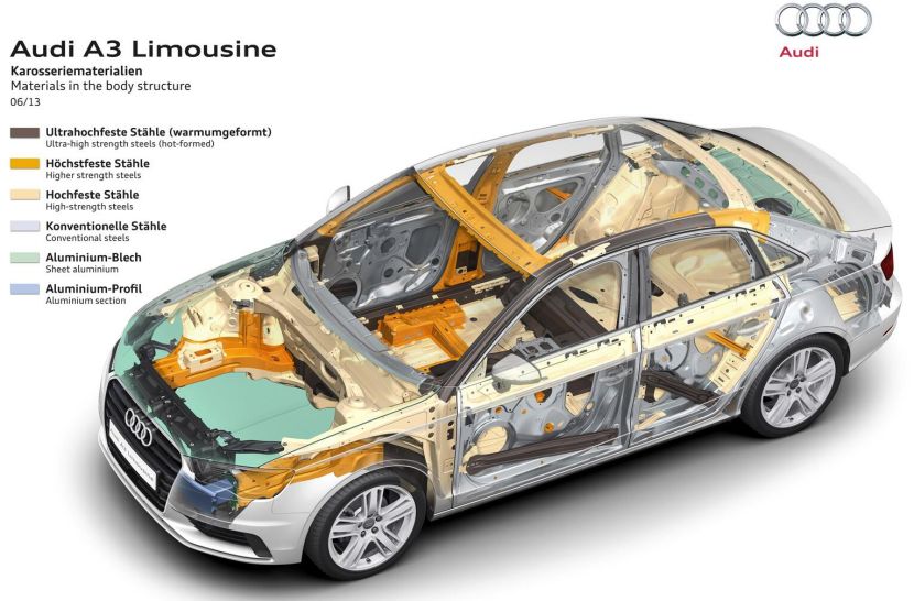 这样的速度撞击,任何车辆都无法幸免。以沃尔沃V40同级别的奥迪A3车身结构为例,我们看奥迪A3 2015款的车身结构图: