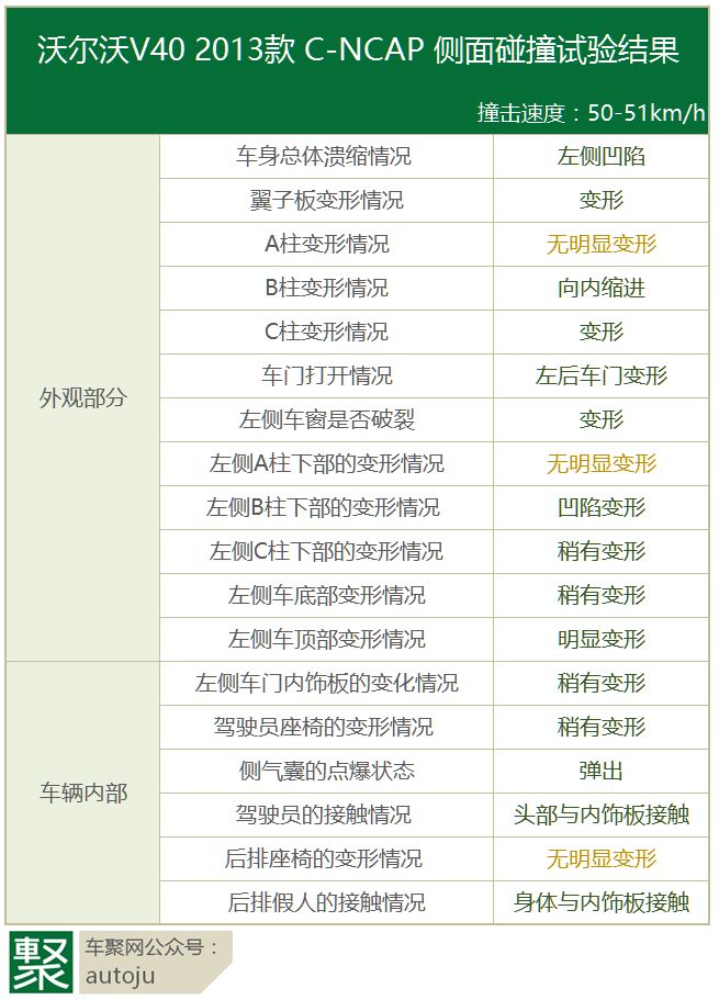车聚君多方了解得知,事发路段限速为每小时60公里。如果奥迪S6以60公里的合法时速行驶,即使撞击沃尔沃V40后腰,根据欧洲和中国的NCAP每小时50公里时速的侧碰结果推断,V40的车身结构只是有一些形变而已。