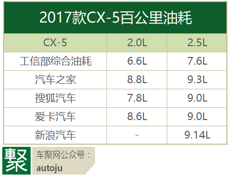 马自达CX-5的油耗表现归功于它搭载的“创驰蓝天”动力总成。车聚君身边的2.5L车主实际油耗为百公里9.4升。