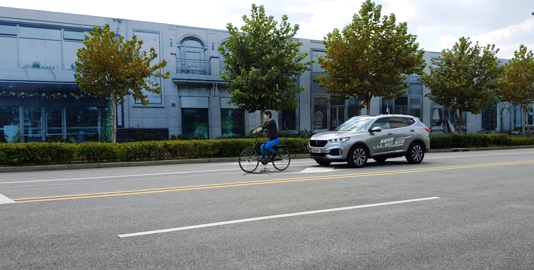 首先说说整个试驾环节主打的主动安全,整个试驾体验在一个全封闭的安全道路上进行。场地分别设置了假汽车与假自行车在前方行驶,VV6在后方模拟“追尾”,每次测试VV6都准确的识别了前方的汽车与自行车。在识别出前方车辆的时候VV6会先减速,如果车辆识别到驾驶员依然没有采取任何动作时,车辆会自动刹停。