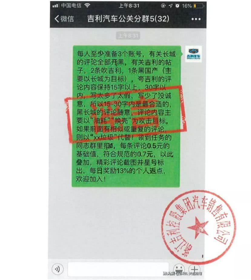 “黑公关”最早源于一张微信截图的流传,微信截图是吉利公关群的名称的微信群,里面一个叫吉利公关经理的人发布了一条消息,意思就是说号召这个群里的人去攻击长城企业的做法。