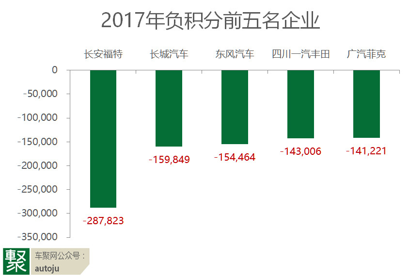 长安福特、长城、东风、四川一汽丰田、广汽菲克五家企业的油耗负积分超过10万,如果不大力改善油耗情况或者发展新能源汽车,成为负分大户。
