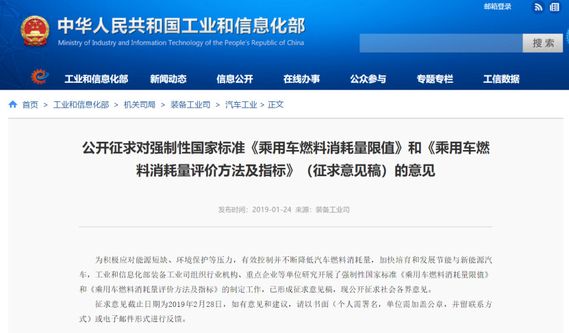 1月24日,工信部官网发布了对《乘用车燃料消耗量限值》和《乘用车燃料消耗量评价方法及指标》的征求意见稿,来公开征求意见。