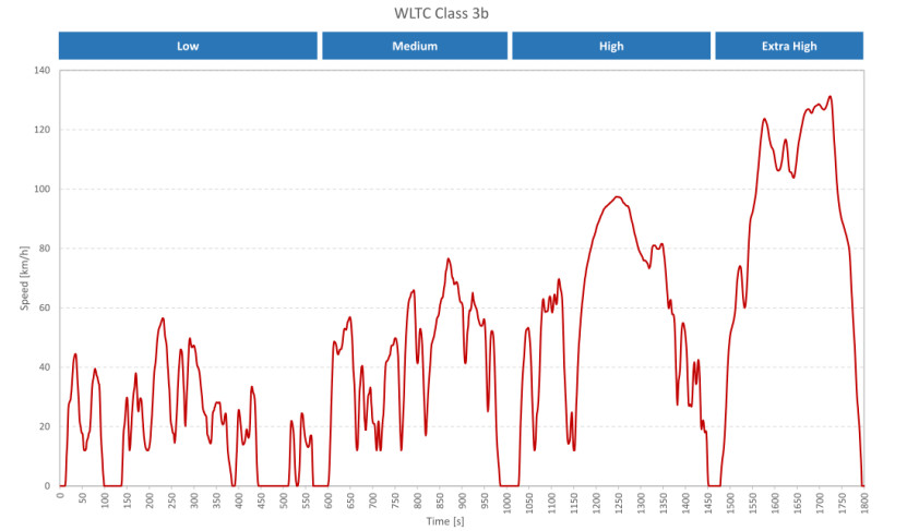 持续时间从NEDC的1180秒提升至1800秒,行驶距离由11km提升至23.25km,最高车速由120km/h提升至131km/h。按照功率质量比和最高车速对车辆进行分类,乘用车适用于Class 3测试工况循环,包括低速段、中速段、高速段、超高速段四部分。