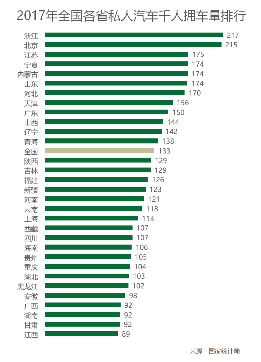 目前来看,东部沿海发达地区,汽车已经相对普及。以苏州为例,2017年苏州常住人口为1068万,2017年汽车保有量为355万,千人汽车保有量约为333辆。厦门常住人口401万人,而目前该市汽车已超130万辆,千人汽车保有量约为333辆。