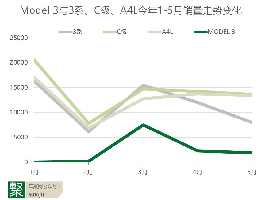 都说Model 3来了,将对宝马3系、奥迪A4L、奔驰C级销量造成冲击,然而国内情况却似乎并非如此。至少从今年1-5月它们的销量走势来看,情况就是如此,而这很大原因在于Model 3目前在国内销量基数较低,对这三款豪华车的影响力有限。