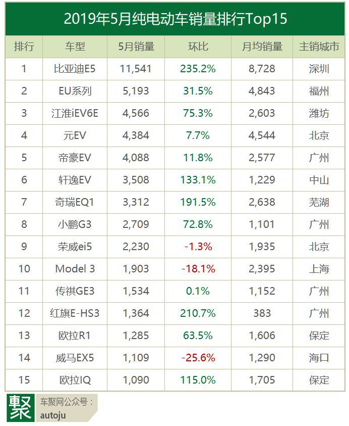 从车型来看,比亚迪e5今年5月销售环比增长235.2%至11,541辆,摘夺冠军,不仅是唯一销量过万的电动车,同时增幅在榜单最高。