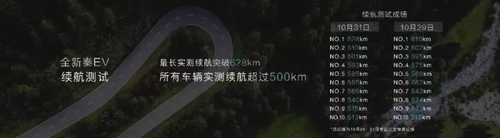 发布会过半,主办方公布了10月底专业人士对全新秦EV续航测试的结果。该车NEDC续航是421km,可所有实测车辆的续航都超过了500km,最好成绩达到了628km!