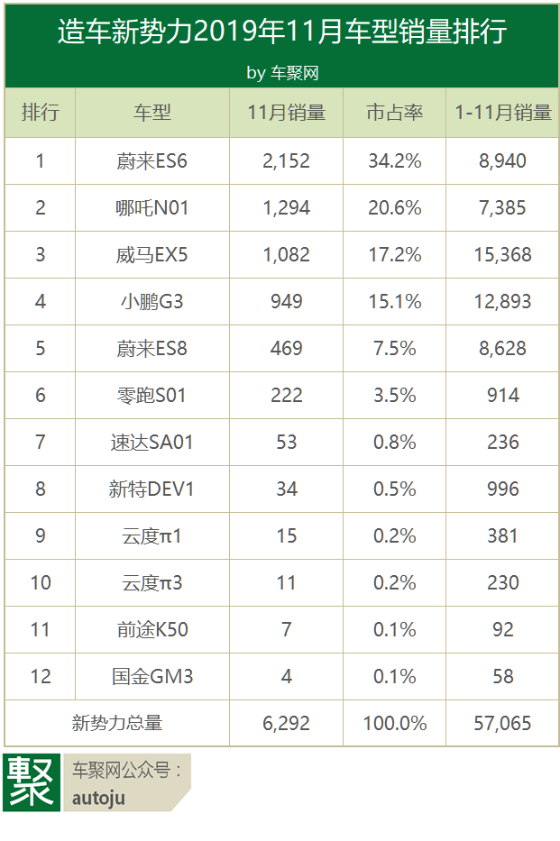 11月新势力销量排行:哪吒超威马 小鹏暂别前三 ES6三连冠|聚数