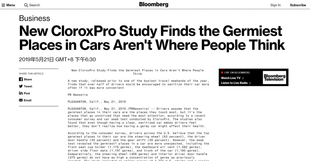 ▲彭博新闻的报道(标题大意为:CloroxPro新研究发现车内细菌最多的地方并非如人们所想)