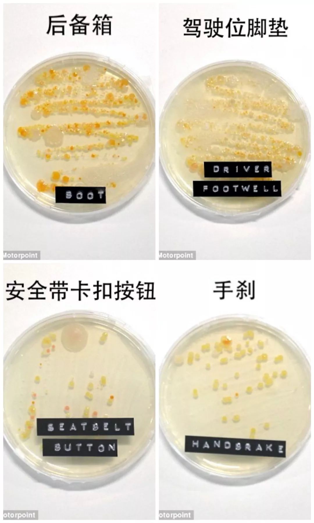 Motorpoint 借到了一部“典型”的私家车,并在车内20个不同的部位用棉签(拭子)擦拭,提取样本后进行细菌培养,以细菌数量的多少,判断该部位的“干净”程度。
