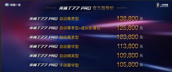 奔腾T77 PRO自动尊享型 123,800元;
