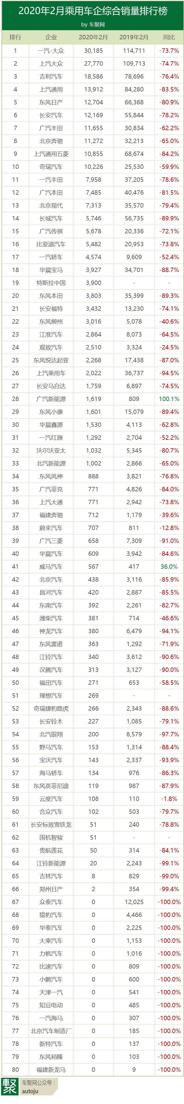 2月车企销量排行:第一仅销3万辆,吉利再进前三 奔驰首进前十|聚数