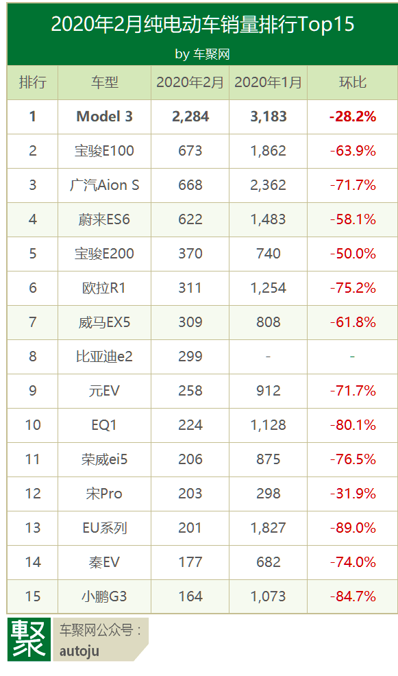2月电动车排行:Model 3卖了2284辆,助特斯拉首次登顶|聚数