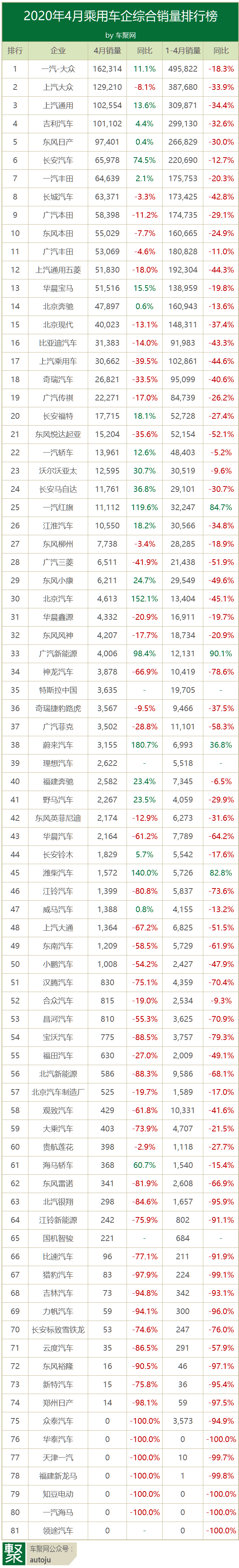 4月车企销量:同比仅下滑5.6%,前十销量占车市63%|聚数