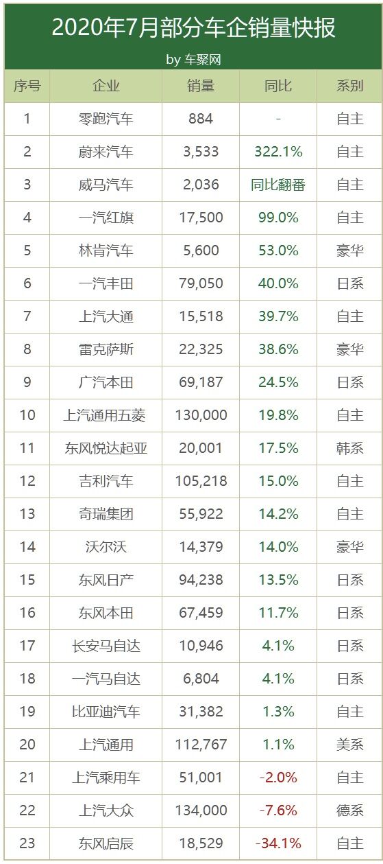 蔚来汽车7月份销售3,533辆,同比增幅高达322.1%,其中ES6销量为2,610辆,ES8销量为923辆;威马汽车7月销售2,036辆,同比翻番,不过据车聚君查得数据,2019年7月威马销量为1,093辆,计算下来威马的增幅应为86.3%;小鹏虽然尚未公布其7月总销量,不过据悉小鹏P7上月已交付1,641辆。