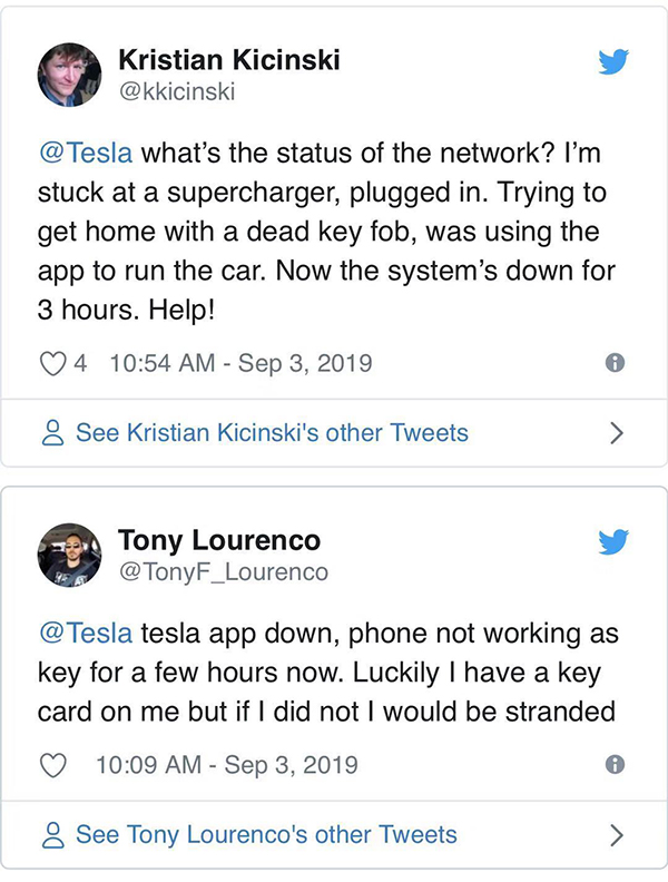 2019年9月3日,特斯拉在美国早高峰期间宕机4小时,导致车主无法使用手机钥匙,不得不打车上班。