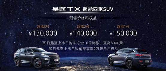 为满足“爱驾一族”对驾控性能的渴望,星途TX“超能四驱版”在本届上海车展上正式开启预售,超能3号预售价13万元、超能2号预售价14万元、超能1号预售价15万元。新车以动力、操控、四驱的核心产品优势,凭借领先同级的10大超能配置,将为以高水准驾控为乐趣的年轻“爱驾一族”带来超越期待的满分选择。