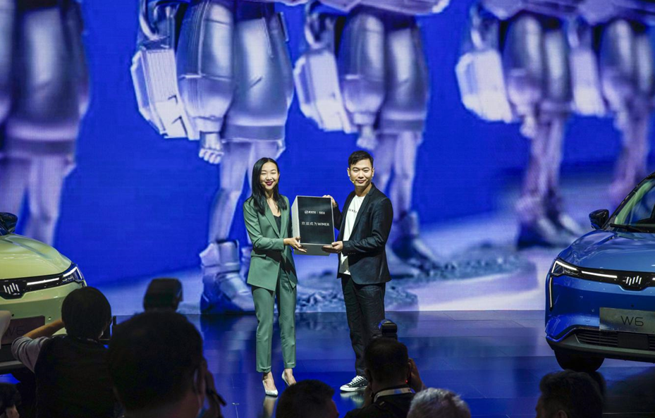来自上海的吴先生从威马汽车首席增长官Cindy手中接过WIMER专属礼盒,成为威马W6首批车主代表