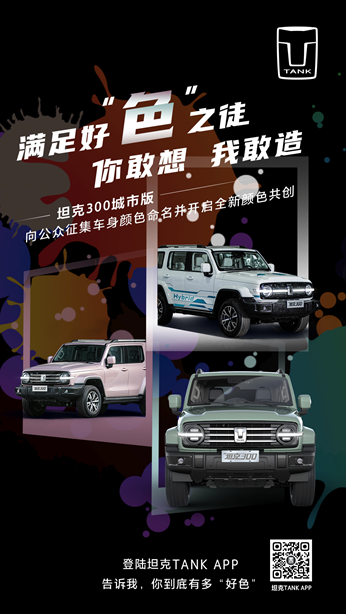其中,坦克300城市版全新时尚颜色的命名将向网友征集共创。未来,坦克300城市版还将开启全新颜色共创,用户可以通过坦克TANK APP参与发挥自己的创意。