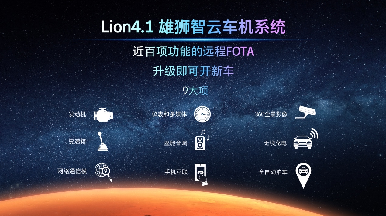 万物互联时代,星途品牌也在持续加速智能化布局,致力营造一个真正懂用户、不断学习迭代的超级智慧座舱。星途凌云400T搭载Lion雄狮智云4.1 系统,该系统配备AR增强型实景导航、"萌驾"和苹果Carplay连接、双12.3吋贯穿式高清液晶屏等悦心配置,更支持FOTA固件升级功能,可实现动力系统、通信网络系统、信息娱乐系统、智能驾驶等九大模块、近百项功能的远程升级,实现人、车、场景的深度融合。